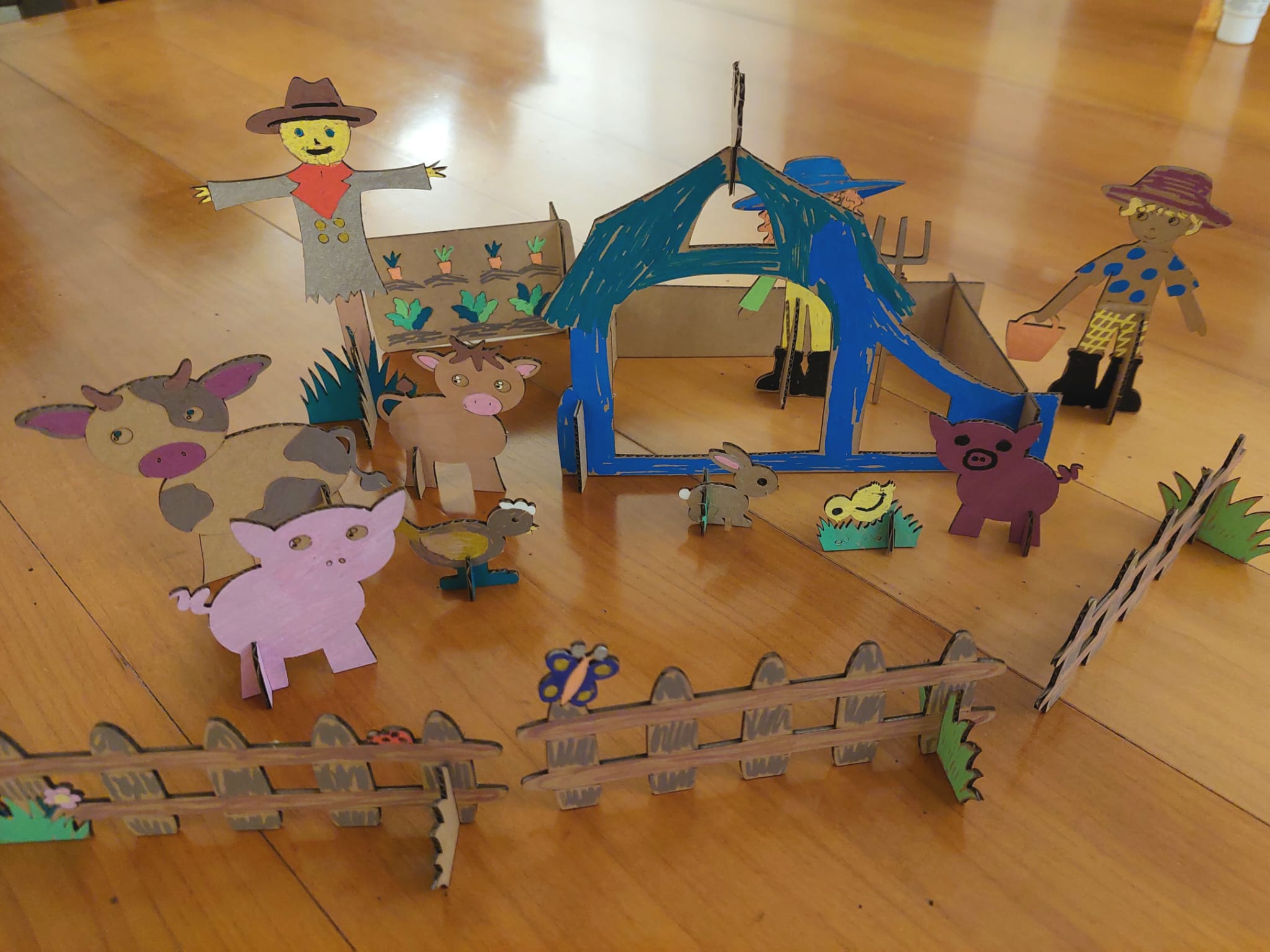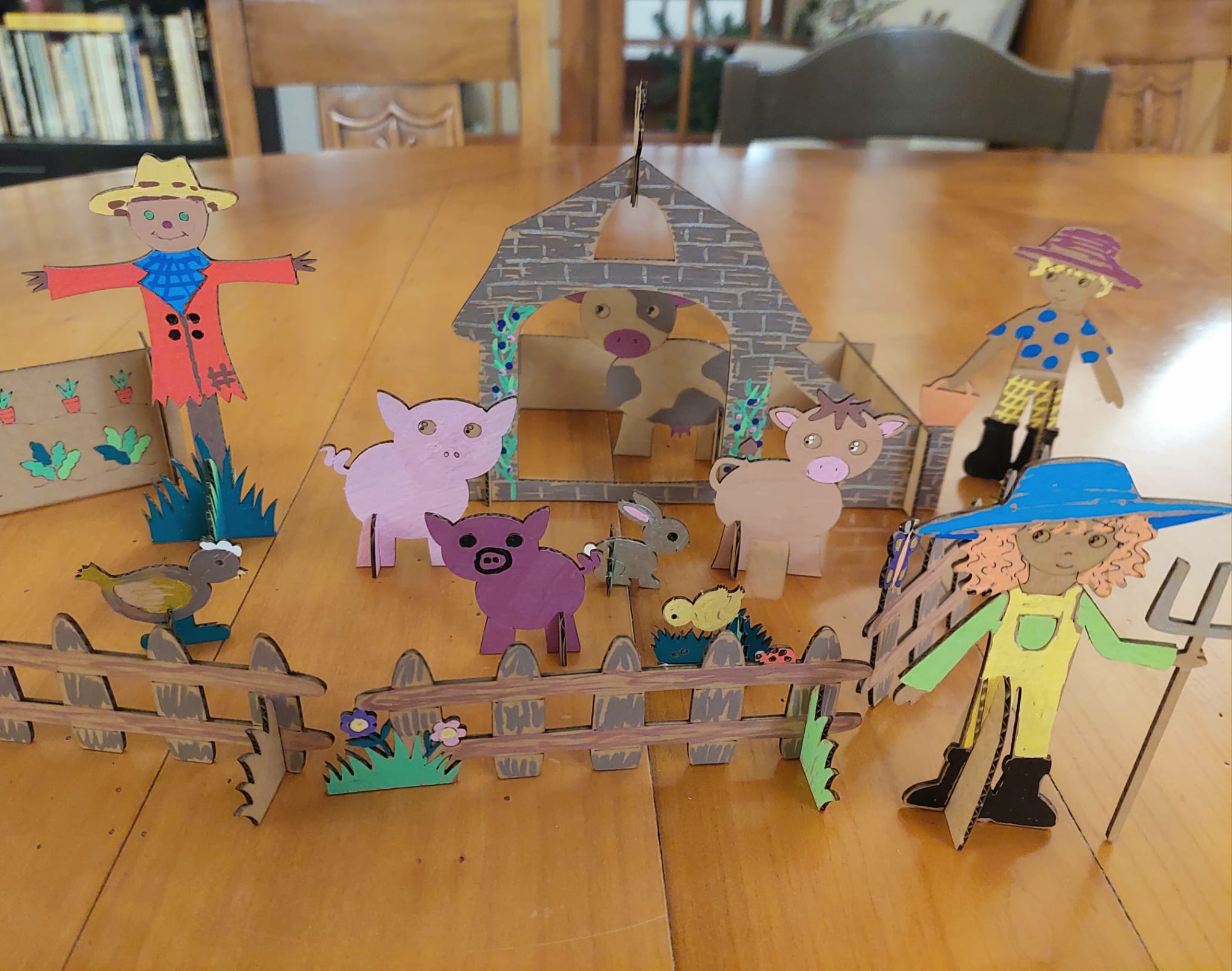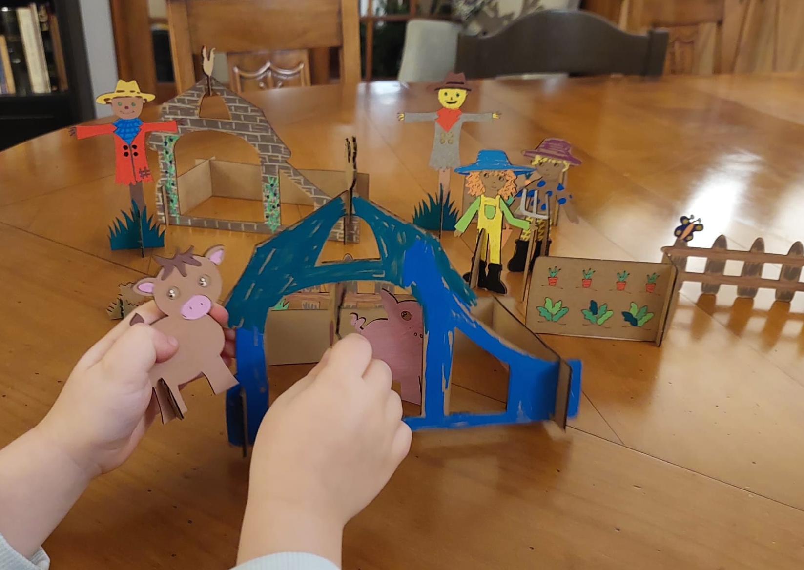Ce kit invite les enfants à colorier et assembler un décor , où les animaux de la fermes prennent vie selon leur imagination.